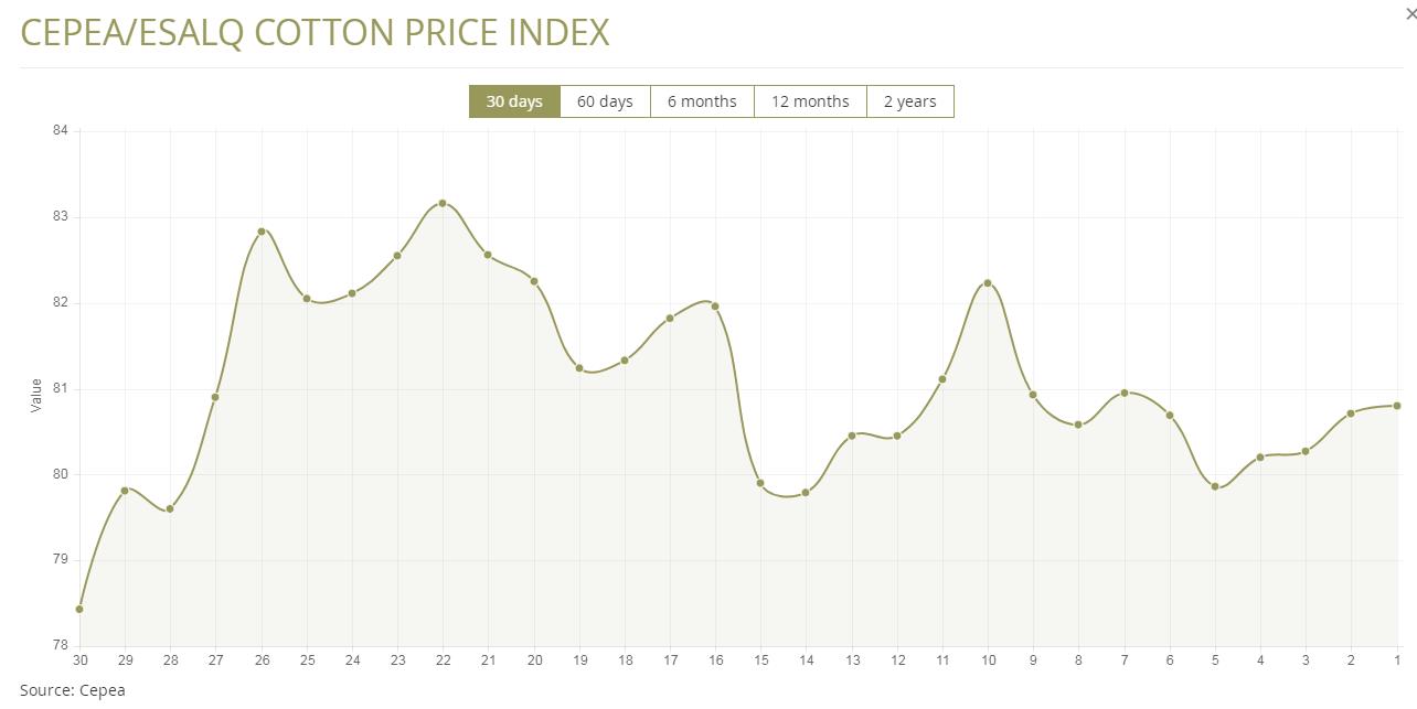 據(jù)外電1月26日消息,1月26日巴西CEPEA/ESALQ棉花價(jià)格指數(shù)報(bào)每磅80.80美分,較前一日上漲0.11%。