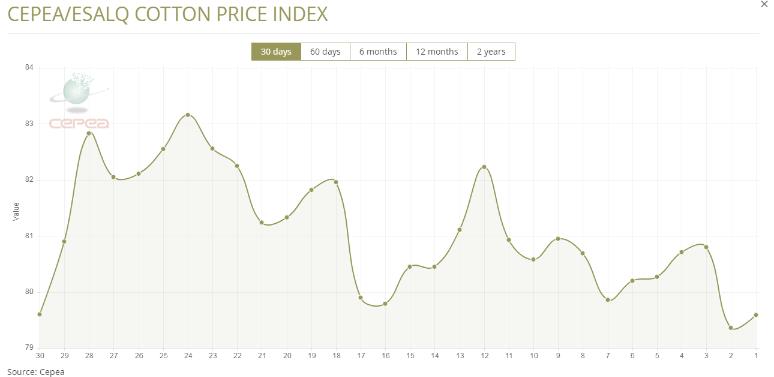 據(jù)外電1月30日消息,1月30日巴西CEPEA/ESALQ棉花價(jià)格指數(shù)報(bào)每磅79.59美分,較前一日上漲0.29%。