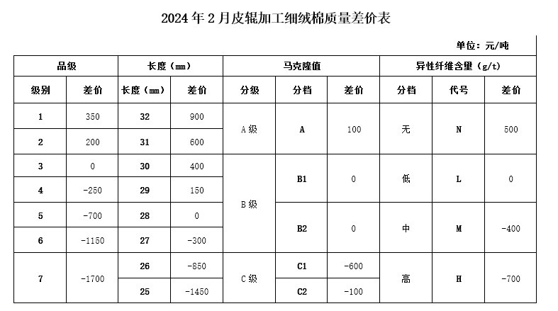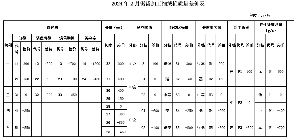 根據(jù)《中國(guó)棉花協(xié)會(huì)國(guó)產(chǎn)棉質(zhì)量差價(jià)表管理辦法》規(guī)定,現(xiàn)正式發(fā)布2024年2月《鋸齒加工細(xì)絨棉質(zhì)量差價(jià)表》、《皮輥加工細(xì)絨棉質(zhì)量差價(jià)表》和《長(zhǎng)絨棉質(zhì)量差價(jià)表》(單位:元/噸)。
