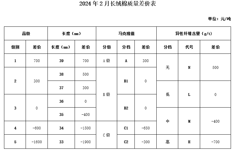 依據(jù)2024年1月的棉花公檢質(zhì)量數(shù)據(jù)、中國(guó)棉花協(xié)會(huì)棉花質(zhì)量?jī)r(jià)差自動(dòng)生成系統(tǒng)采集的棉花加工企業(yè)銷(xiāo)售成交價(jià)、紡織企業(yè)監(jiān)測(cè)點(diǎn)的采集數(shù)據(jù)及當(dāng)月的中國(guó)棉花價(jià)格指數(shù),并征求業(yè)內(nèi)相關(guān)專(zhuān)家的意見(jiàn),與上月相比,2024年2月《鋸齒加工細(xì)絨棉質(zhì)量差價(jià)表》、《皮輥加工細(xì)絨棉質(zhì)量差價(jià)表》和《長(zhǎng)絨棉質(zhì)量差價(jià)表》差價(jià)保持不變。
