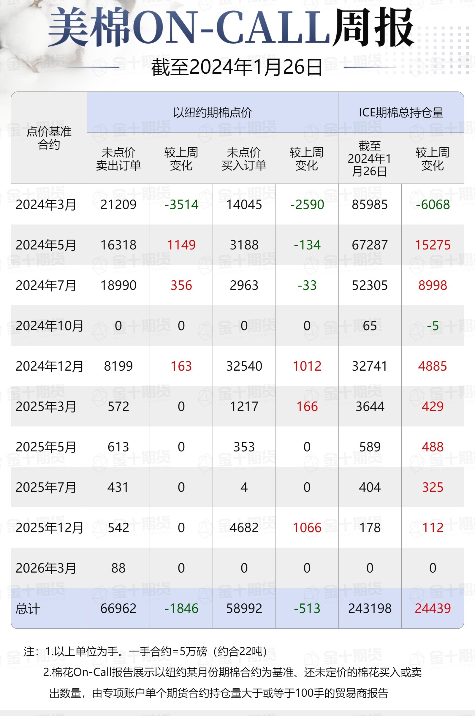 據(jù)美國商品期貨交易委員會(CFTC)最新數(shù)據(jù),截至1月26日,①美棉On-Call未點(diǎn)價(jià)賣出訂單66962手,環(huán)比減少1846手;未點(diǎn)價(jià)買入訂單58992手,環(huán)比減少513手;②ICE期棉2403合約上賣方未點(diǎn)價(jià)合約為21209手,較此前一周減少3514手;③ICE期棉2405合約上賣方未點(diǎn)價(jià)合約為16318手,較此前一周增加1149手;④ICE期棉2407合約上賣方未點(diǎn)價(jià)合約為18990手,較此前一周增加356手;⑤ICE棉花期貨盤面2023/24年度(8月至次年7月)的On-Call合約未點(diǎn)價(jià)賣出訂單為56517手,環(huán)比減少2009手。