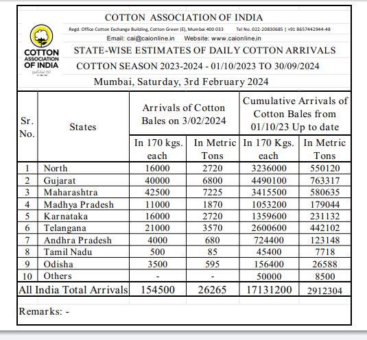 據外電2月3日消息,印度棉花協(xié)會(CAI)公布,2月3日印度棉花到貨量估計為154500包(每包170公斤)或26265噸。