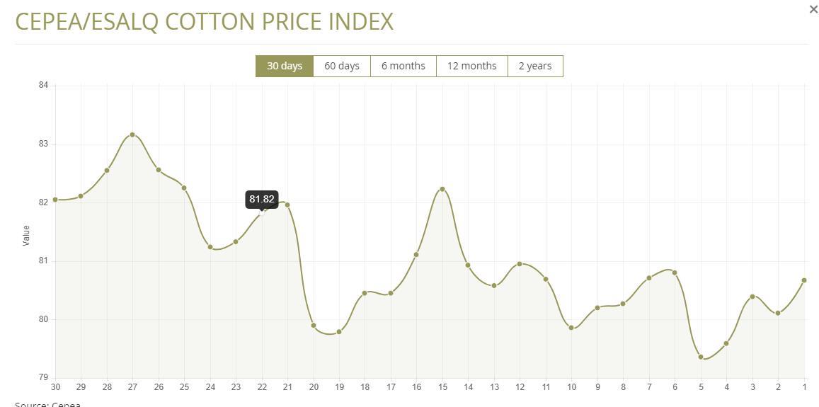 據(jù)外電2月2日消息,2月2日巴西CEPEA/ESALQ棉花價格指數(shù)報每磅80.67美分,較前一日上漲0.7%。