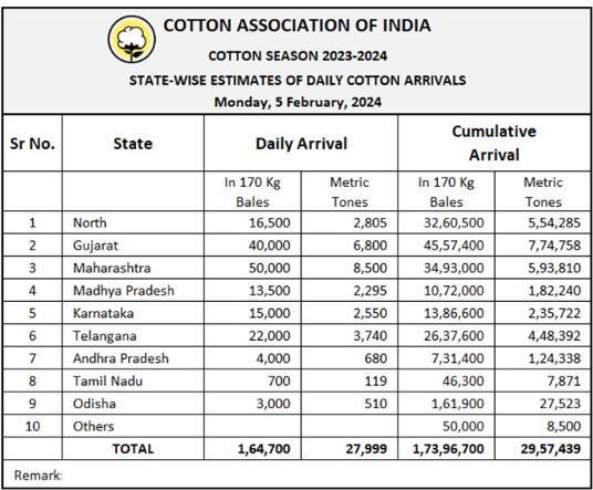2023/24年度(2023年10月1日至次年9月)迄今,印度棉花到貨量為17396700包或2957439噸。