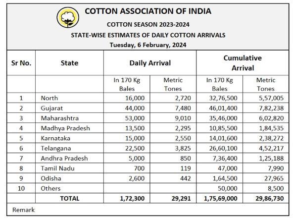 據(jù)外電2月6日消息,印度棉花協(xié)會(huì)(CAI)公布,2月6日印度棉花到貨量估計(jì)為172300包(每包170公斤)或29291噸。
