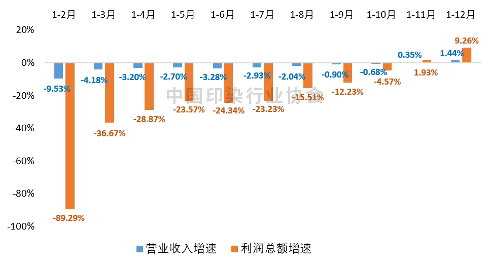 2023年1-12月規(guī)模以上印染企業(yè)營(yíng)業(yè)收入和利潤(rùn)總額增速情況