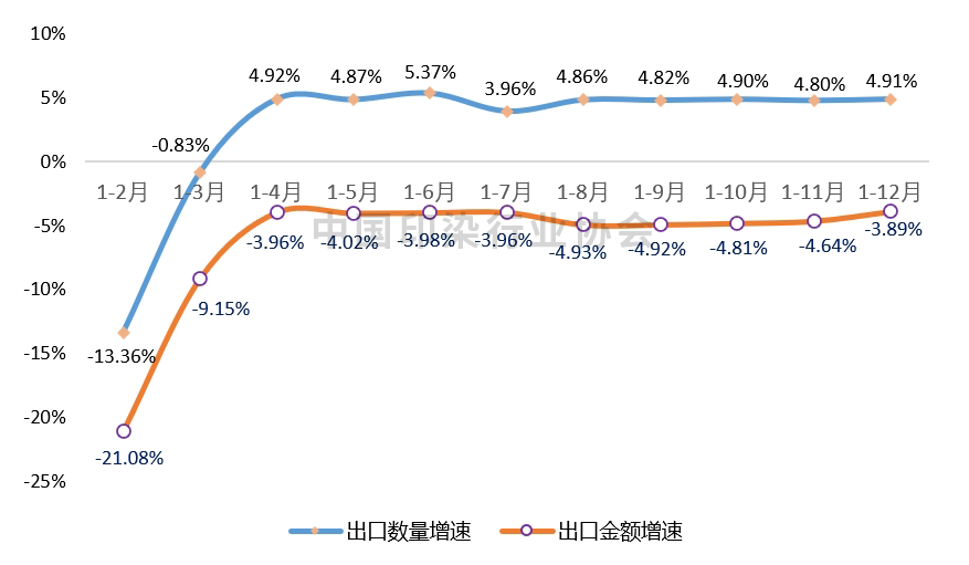 2023年,受?chē)?guó)際市場(chǎng)需求收縮、國(guó)際貿(mào)易風(fēng)險(xiǎn)上升等因素影響,我國(guó)印染行業(yè)出口承壓開(kāi)局,2季度開(kāi)始出口增速保持基本平穩(wěn),主要產(chǎn)品出口呈現(xiàn)量升價(jià)跌態(tài)勢(shì),4季度海外需求有所改善,推動(dòng)出口金額降幅持續(xù)收窄。據(jù)中國(guó)海關(guān)數(shù)據(jù),1-12月我國(guó)印染八大類(lèi)產(chǎn)品出口數(shù)量311.86億米,同比增長(zhǎng)4.91%,增速較前3季度小幅提高0.09個(gè)百分點(diǎn);出口金額301.25億美元,同比降低3.89%,降幅較前3季度收窄1.03個(gè)百分點(diǎn);出口平均單價(jià)0.97美元/米,同比降低8.39%,降幅較前3季度收窄0.90個(gè)百分點(diǎn)。
