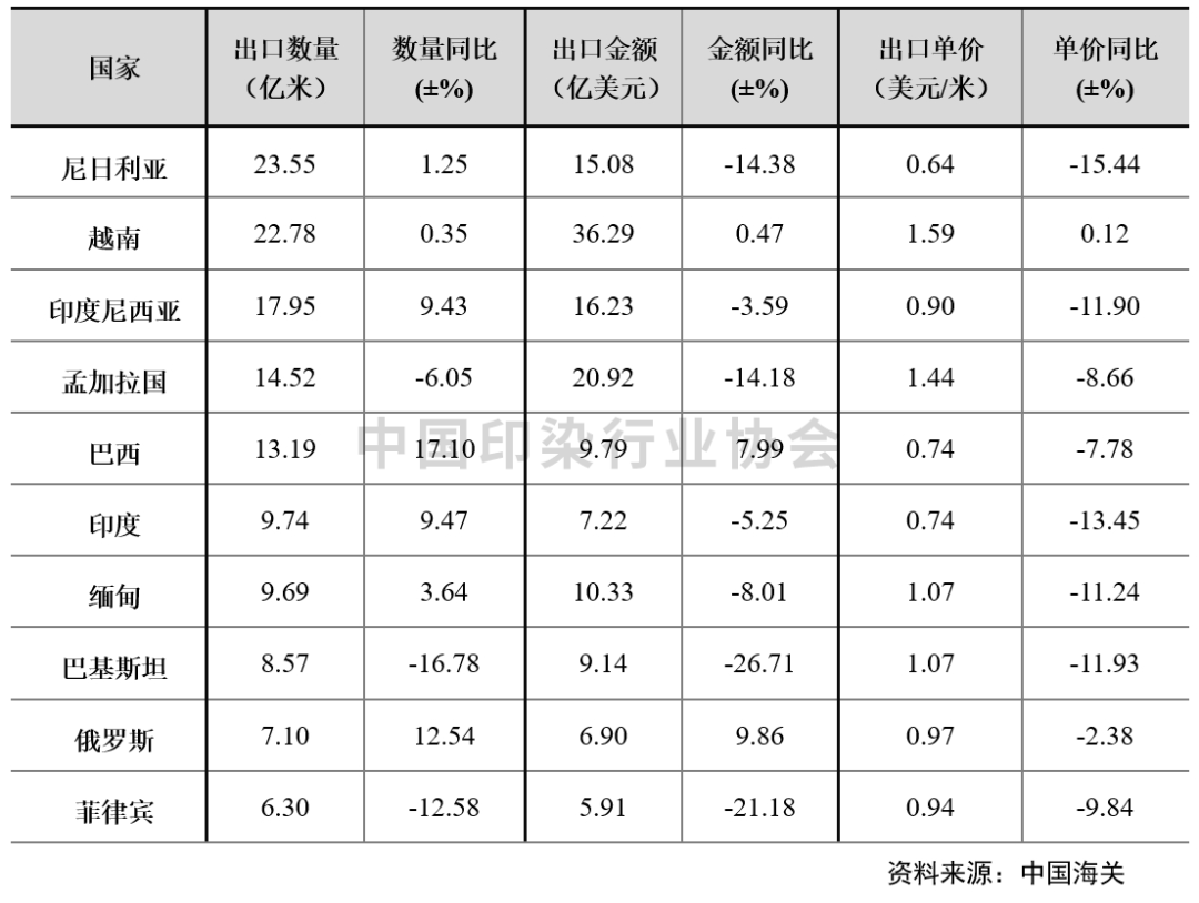 2023年1-12月我國(guó)印染八大類(lèi)產(chǎn)品出口前10國(guó)家情況