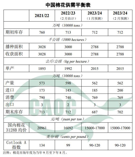 本月將2023/24年度棉花進(jìn)口量上調(diào)15萬(wàn)噸至200萬(wàn)噸,期末庫(kù)存上調(diào)至702萬(wàn)噸,其他供需預(yù)測(cè)數(shù)據(jù)與上月保持一致。2023/24年度棉花銷售進(jìn)度較上年有所加快,據(jù)國(guó)家棉花市場(chǎng)監(jiān)測(cè)系統(tǒng)數(shù)據(jù),截至2月1日,全國(guó)棉花銷售率為35.9%,同比增長(zhǎng)7.3個(gè)百分點(diǎn),較過去四年均值下降6.1個(gè)百分點(diǎn)。