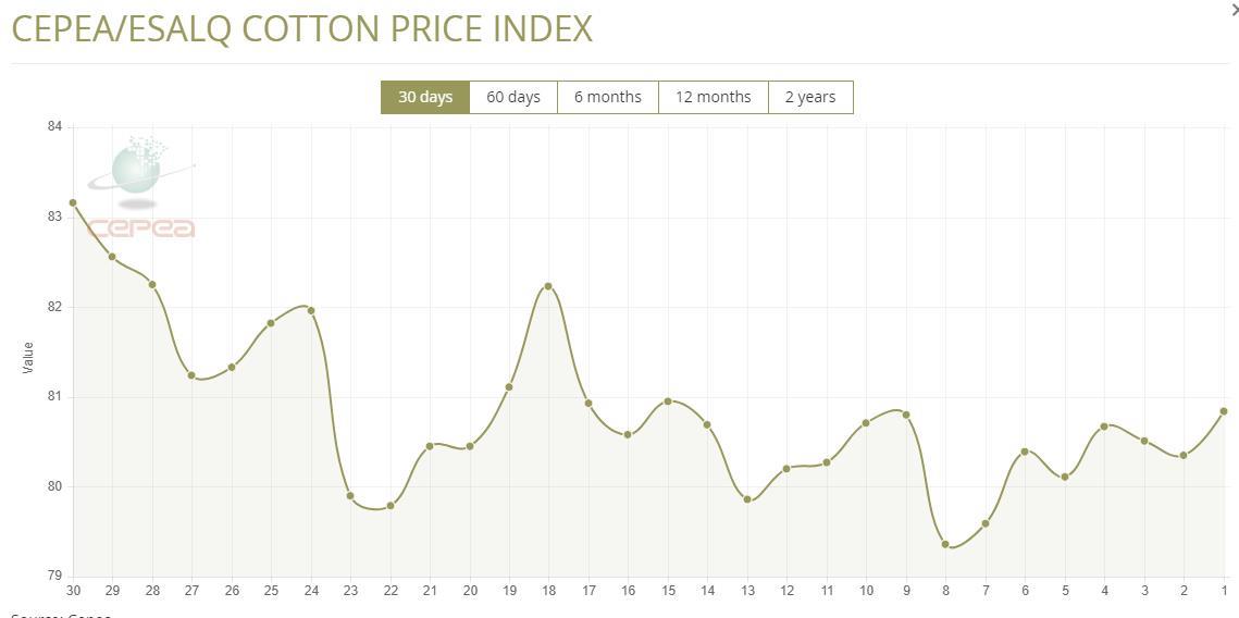 據(jù)外電2月7日消息,2月7日巴西CEPEA/ESALQ棉花價(jià)格指數(shù)報(bào)每磅80.84美分,較前一日上漲0.61%。