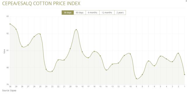 據(jù)外電2月8日消息,2月8日巴西CEPEA/ESALQ棉花價(jià)格指數(shù)報(bào)每磅79.59美分,較前一日下跌1%。