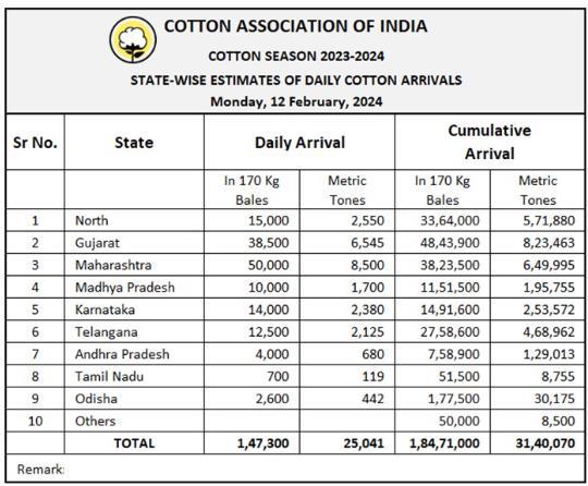 2023/24年度(2023年10月1日至次年9月)迄今,印度棉花到貨量為18471000包,或3140070噸。