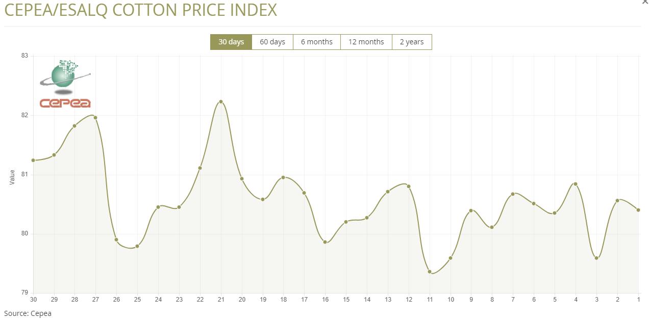 據(jù)外電2月14日消息,2月14日巴西CEPEA/ESALQ棉花價(jià)格指數(shù)報(bào)每磅80.40美分,較前一日下跌0.2%。