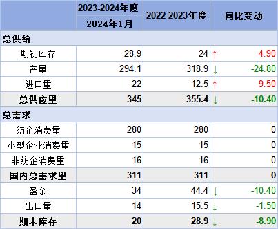 以下為印度棉花協(xié)會(huì)供需平衡表:?jiǎn)挝唬菏f(wàn)包(1包=170公斤)