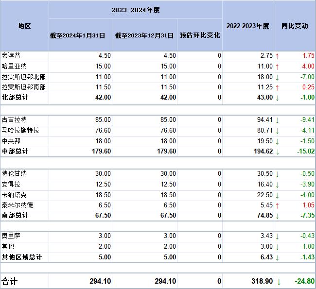 棉花可用過(guò)剩量預(yù)估保持340萬(wàn)包不變,低于上一年度的過(guò)剩量預(yù)估值444萬(wàn)包。印度棉花出口預(yù)計(jì)將從155萬(wàn)包減少到140萬(wàn)包。此外預(yù)計(jì)2024年9月本年度結(jié)束時(shí)的期末庫(kù)存為200萬(wàn)包,上一年度期末庫(kù)存預(yù)估為289萬(wàn)包。