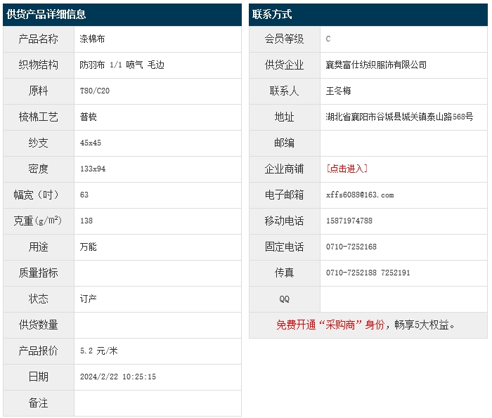 2月22日,襄樊富仕紡織服飾有限公司滌棉防羽布T80/C20 45x45 133x94 63" 138g/㎡ 1/1 噴氣 毛邊,報(bào)價(jià)為5.2元/米,實(shí)際成交價(jià)以協(xié)商為準(zhǔn)。[點(diǎn)擊查看詳情]