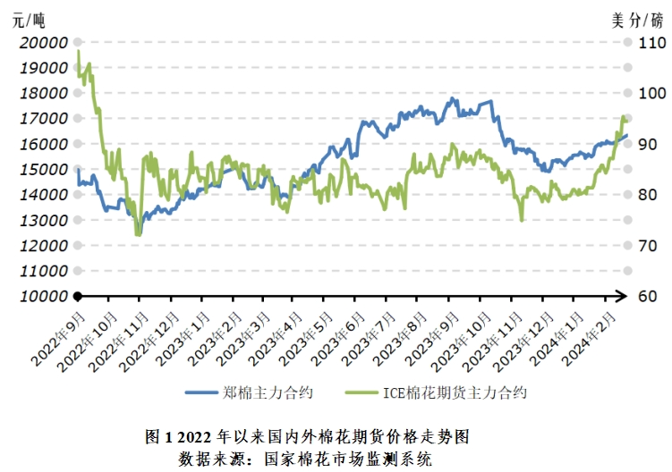 2024年春節(jié)前,國內(nèi)棉市交易平淡,期現(xiàn)貨價(jià)格持穩(wěn)運(yùn)行。春節(jié)期間美棉出口簽約同比大幅增加,美棉供應(yīng)趨緊擔(dān)憂加重,在投機(jī)資金助力下ICE期棉一路“飆升”至近16個(gè)月以來高位,節(jié)后國內(nèi)紡織終端產(chǎn)銷尚未恢復(fù),市場觀望情緒較濃,鄭棉僅現(xiàn)小幅補(bǔ)漲。截至2024年2月15日,2023/24年度美棉出口累計(jì)凈簽約量184.67萬噸,占年度出口目標(biāo)(267.8萬噸)的69%,同比增長45%。截至2月23日,ICE期棉主力合約結(jié)算價(jià)94.93美分/磅,較1月均價(jià)上漲15.1%;代表進(jìn)口棉中國主港到岸均價(jià)的國際棉花指數(shù)(M)104.17美分/磅,較1月均價(jià)上漲13.1%,折1%關(guān)稅人民幣進(jìn)口成本17993元/噸。鄭州商品交易所棉花期貨主力合約結(jié)算價(jià)16320元/噸,較1月均價(jià)上漲3.8%;代表內(nèi)地標(biāo)準(zhǔn)級(jí)皮棉市場價(jià)格的國家棉花價(jià)格B指數(shù)17030元/噸,較1月均價(jià)上漲3%。