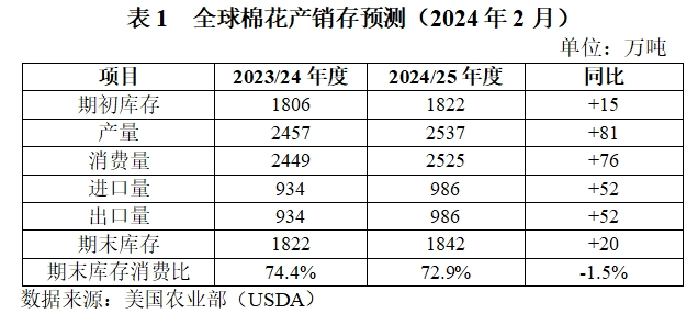 2023/24年度已近半,全球棉花產(chǎn)需基本平衡,市場關(guān)注熱點(diǎn)逐步向下年度轉(zhuǎn)移。據(jù)美國農(nóng)業(yè)部預(yù)測,2024/25年度全球棉花產(chǎn)量2537萬噸,同比增加81萬噸;全球棉花消費(fèi)量2525萬噸,同比增加76萬噸;產(chǎn)大于需12萬噸,庫存消費(fèi)比72.9%,同比下降1.5個(gè)百分點(diǎn)(表1)。總體看,2024/25年度全球棉花供需狀況與2023/24年度相比沒有大的變化。