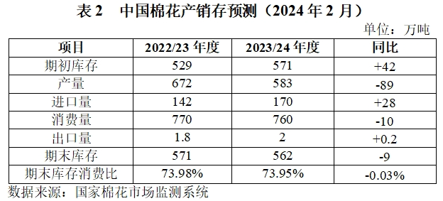 2023/24年度棉花產(chǎn)量基本清晰,但消費(fèi)復(fù)蘇的趨勢尚未明朗。全球地緣政治沖突持續(xù)升級(jí),是否會(huì)導(dǎo)致部分海外訂單向我國轉(zhuǎn)移需密切關(guān)注。據(jù)國家棉花市場監(jiān)測系統(tǒng)預(yù)測,2023/24年度中國棉花產(chǎn)量583萬噸,同比減少89萬噸;消費(fèi)量760萬噸,同比減少10萬噸;產(chǎn)需缺口177萬噸,同比擴(kuò)大79萬噸(表2)。