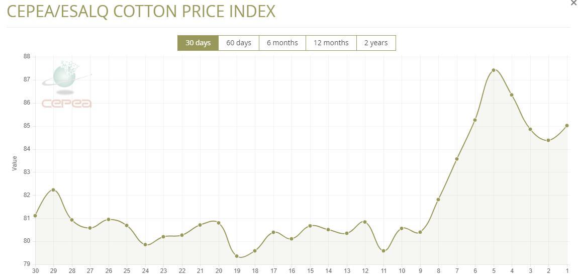 據(jù)外電2月26日消息,2月26日巴西CEPEA/ESALQ棉花價格指數(shù)報每磅85.02美分,較前一日上漲0.76%。