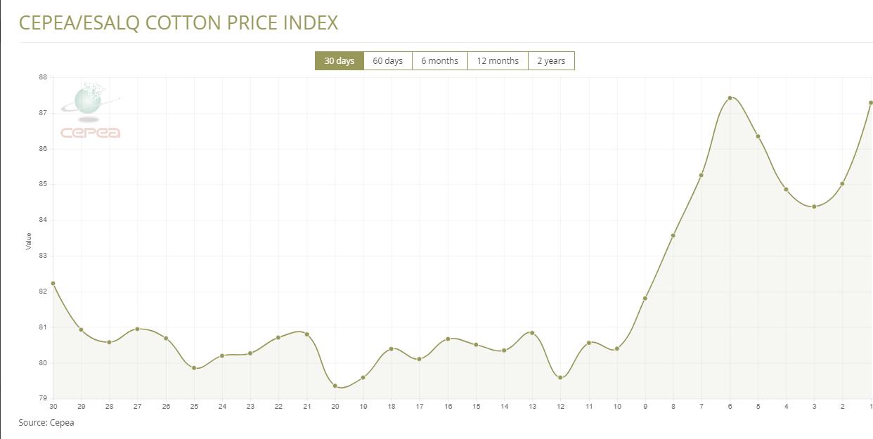 據(jù)外電2月27日消息,2月27日巴西CEPEA/ESALQ棉花價格指數(shù)報每磅87.29美分,較前一日上漲2.67%。
