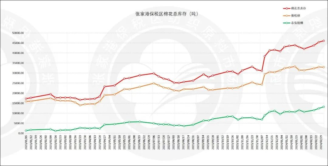 據(jù)張家港保稅區(qū)紡織原料市場統(tǒng)計(jì),截至2024年3月4日,張家港保稅區(qū)棉花總庫存4.6萬噸,環(huán)比增加1.45%;其中保稅棉3.29萬噸,環(huán)比減少0.44%,非保稅棉1.32萬噸,環(huán)比增加6.51%。從進(jìn)口棉來源地看,張家港保稅區(qū)棉花庫存中:美棉占比27.37%,環(huán)比增加4.75個(gè)百分點(diǎn);巴西棉占比31.26%,環(huán)比減少6.55個(gè)百分點(diǎn);印度棉占比2.71%,環(huán)比增加2.55個(gè)百分點(diǎn);其他國家及地區(qū)占比6.54%,環(huán)比減少32.89個(gè)百分點(diǎn)。當(dāng)周進(jìn)口棉進(jìn)出入庫動(dòng)態(tài)變化情況,張家港保稅區(qū)棉花庫存中,出庫2699.66噸,入庫5385.08噸,凈入庫(2685.42)噸。