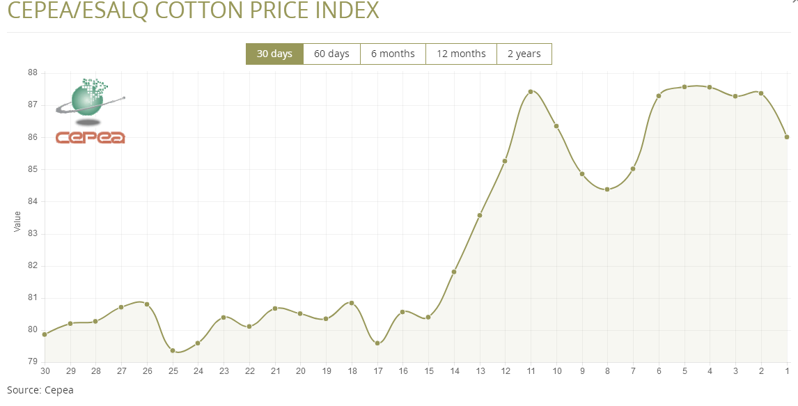 據(jù)外電3月5日消息,3月5日巴西CEPEA/ESALQ棉花價(jià)格指數(shù)報(bào)每磅86.01美分,較前一日下跌1.56%。