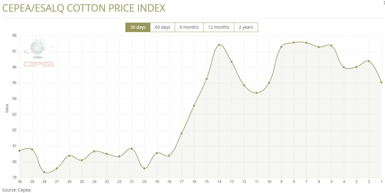 據(jù)外電3月8日消息,3月8日巴西CEPEA/ESALQ棉花價格指數(shù)報每磅85.05美分,較前一日下跌1.55%。