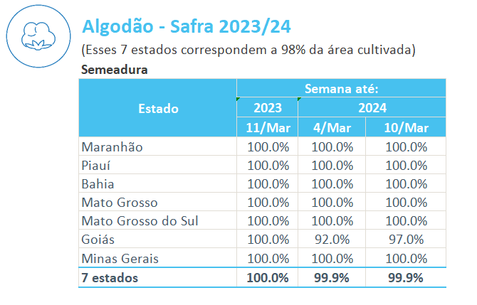據(jù)巴西農(nóng)業(yè)部下屬的國(guó)家商品供應(yīng)公司CONAB,截至3月10日,巴西棉花播種率為99.9%,上周為99.9%,去年同期為100.0%。