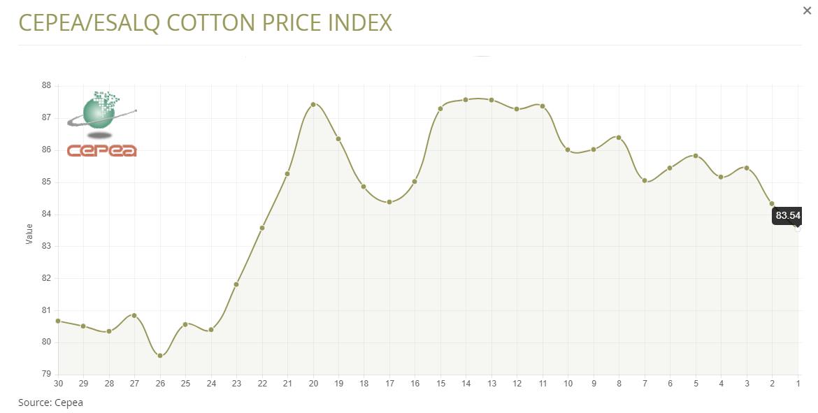 據(jù)外電3月18日消息,3月18日巴西CEPEA/ESALQ棉花價格指數(shù)報每磅83.54美分,較前一日下滑0.94%。