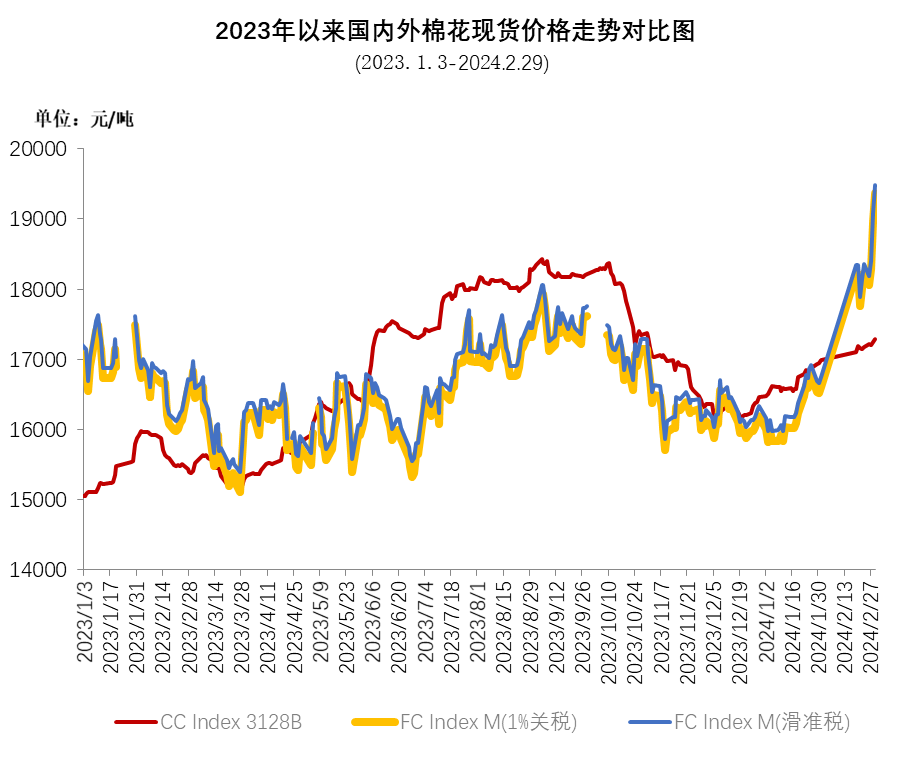 2月,受外圍股市、能源市場(chǎng)走高的帶動(dòng),加上USDA報(bào)告調(diào)減2023/24年度全球棉花產(chǎn)量,調(diào)增消費(fèi)量,推動(dòng)棉價(jià)持續(xù)上漲,ICE期棉主力合約突破100美分/磅,最高漲至103.8美分/磅,月末因美棉簽約數(shù)據(jù)表現(xiàn)不佳,ICE期棉主力合約回落至100美分/磅以下。ICE期棉主力合約2月均結(jié)算價(jià)92.61美分/磅,環(huán)比上漲10.04美分,漲幅12.2%。中國(guó)進(jìn)口棉價(jià)格指數(shù)FCIndexM月均101.82美分/磅,環(huán)比上漲8.92美分;月底為110.97美分/磅,環(huán)比上漲15.7美分,1%關(guān)稅下折人民幣19368元/噸,高于同期中國(guó)棉花價(jià)格指數(shù)(CCIndex3128B)2073元。