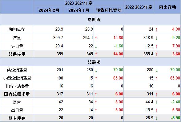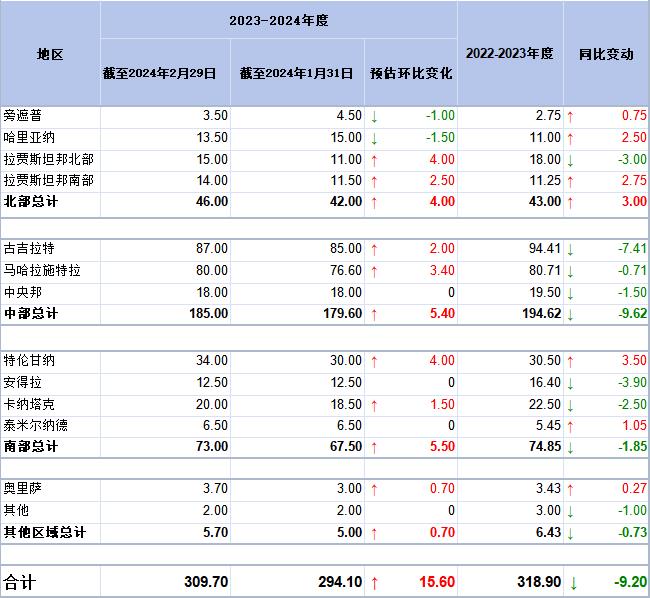 2023/24年度至2月棉花供需情況顯示,截至2月底棉花到貨量估計(jì)2268.2萬(wàn)包。Ganatra說(shuō):“約有100-120萬(wàn)包上年度籽棉(此前因預(yù)期價(jià)格上漲而囤貨不賣(mài))在9-10月期間進(jìn)入市場(chǎng),導(dǎo)致預(yù)估值有所調(diào)整。”