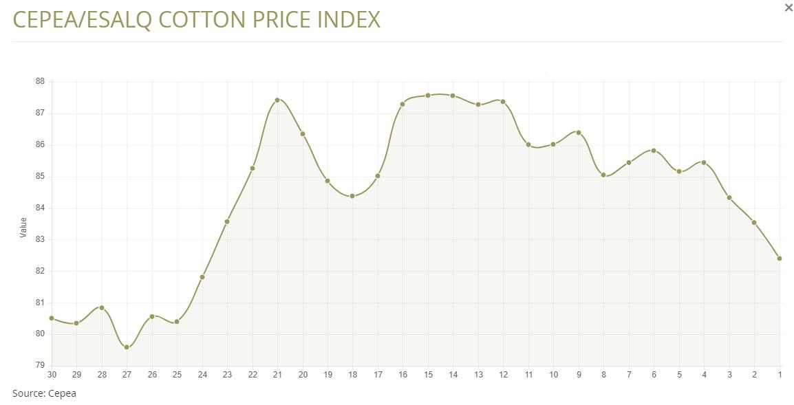 據(jù)外電3月19日消息,3月19日巴西CEPEA/ESALQ棉花價(jià)格指數(shù)報(bào)每磅82.40美分,較前一日下滑1.36%。