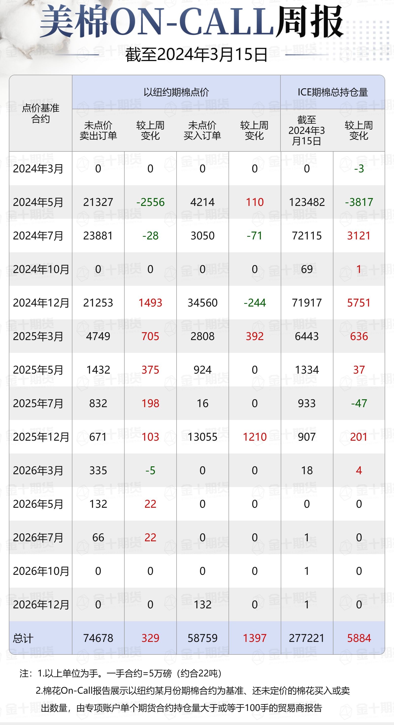 據(jù)美國商品期貨交易委員會(CFTC)最新數(shù)據(jù),截至3月15日,①美棉On-Call未點(diǎn)價(jià)賣出訂單74678手,環(huán)比增加329手;未點(diǎn)價(jià)買入訂單58759手,環(huán)比增加1397手;②ICE期棉2403合約上賣方未點(diǎn)價(jià)合約為0手,較此前一周增加0手;③ICE期棉2405合約上賣方未點(diǎn)價(jià)合約為21327手,較此前一周減少2556手;④ICE期棉2407合約上賣方未點(diǎn)價(jià)合約為23881手,較此前一周減少28手;⑤ICE棉花期貨盤面2023/24年度(8月至次年7月)的On-Call合約未點(diǎn)價(jià)賣出訂單為45208手,環(huán)比減少2584手。