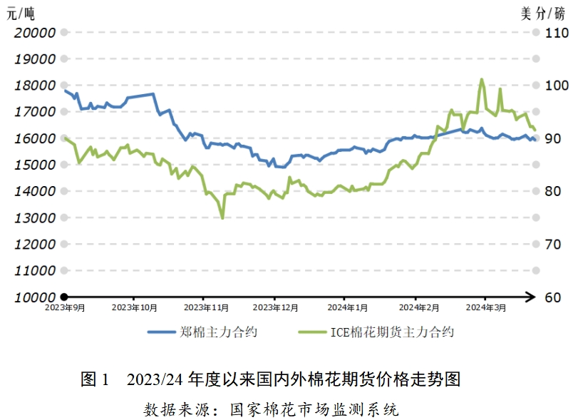 2023/24年度國際棉花供需充裕狀況有所收緊,終端服裝市場去庫仍較緩慢。2月底以來ICE期價大漲后回調,暫時處盤整狀態(tài)。