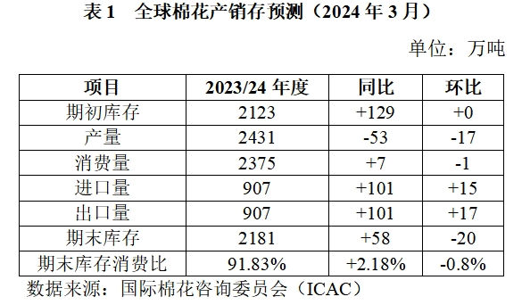 3月,據國際棉花咨詢委員會(ICAC)預測,2023/24年度全球棉花產量2431萬噸,環(huán)比調減17萬噸;棉花消費量2375萬噸,環(huán)比調減1萬噸;期末庫存2181萬噸,環(huán)比調減20萬噸;棉花庫存消費比91.83%,環(huán)比調減0.8個百分點。其中調增中國消費量30萬噸、進口量25萬噸,調增巴西、美國出口量21萬噸、4萬噸。