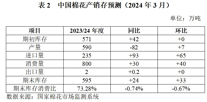據國家棉花市場監(jiān)測系統(tǒng)預測,2023/24年度中國棉花產量590萬噸,環(huán)比調增7萬噸;消費量800萬噸,環(huán)比調增40萬噸;產需缺口210萬噸,同比擴大112萬噸。進口量235萬噸,環(huán)比調增65萬噸;期末庫存595萬噸,環(huán)比調增33萬噸。