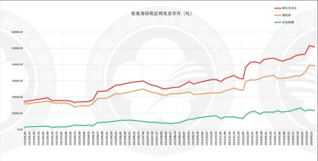 據(jù)張家港保稅區(qū)紡織原料市場(chǎng)統(tǒng)計(jì),截至2024年3月25日,張家港保稅區(qū)棉花總庫(kù)存5.1萬(wàn)噸,環(huán)比減少1.29%;其中保稅棉3.92萬(wàn)噸,環(huán)比減少0.72%,非保稅棉1.17萬(wàn)噸,環(huán)比減少3.18%。從進(jìn)口棉來(lái)源地來(lái)看,張家港保稅區(qū)棉花庫(kù)存中:美棉占比27.16%,環(huán)比增加0.97個(gè)百分點(diǎn);巴西棉占比33.05%,環(huán)比減少0.6個(gè)百分點(diǎn);印度棉占比5.36%,環(huán)比增加1.41個(gè)百分點(diǎn);其他國(guó)家及地區(qū)占比34.43%,環(huán)比減少1.79個(gè)百分點(diǎn)。當(dāng)周進(jìn)口棉進(jìn)出入庫(kù)動(dòng)態(tài)變化情況,張家港保稅區(qū)棉花庫(kù)存中,出庫(kù)3136.88噸,入庫(kù)2434.73噸,凈入庫(kù)(-702.15)噸。