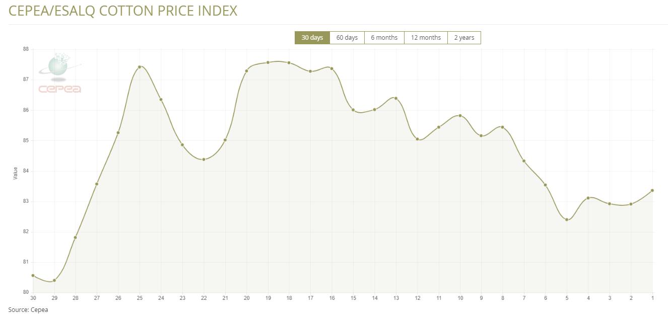 據(jù)外電3月25日消息,3月25日巴西CEPEA/ESALQ棉花價(jià)格指數(shù)報(bào)每磅83.36美分,較前一日上漲0.54%。