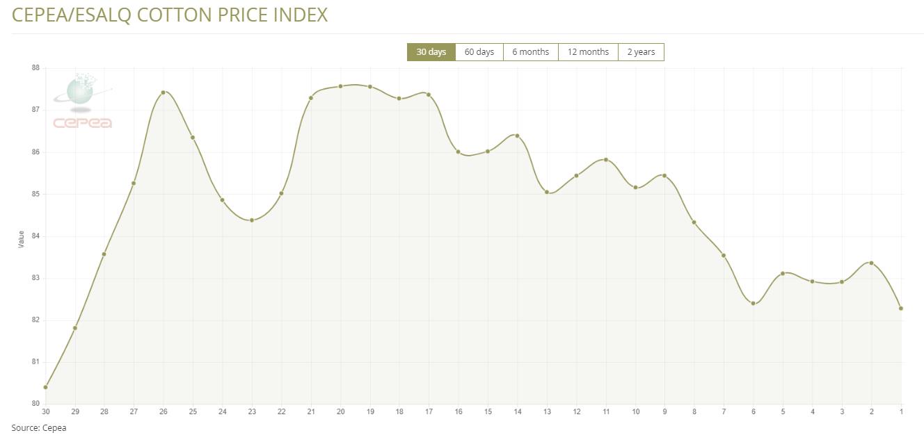 據(jù)外電3月26日消息,3月26日巴西CEPEA/ESALQ棉花價(jià)格指數(shù)報(bào)每磅82.28美分,較前一日下跌1.30%。