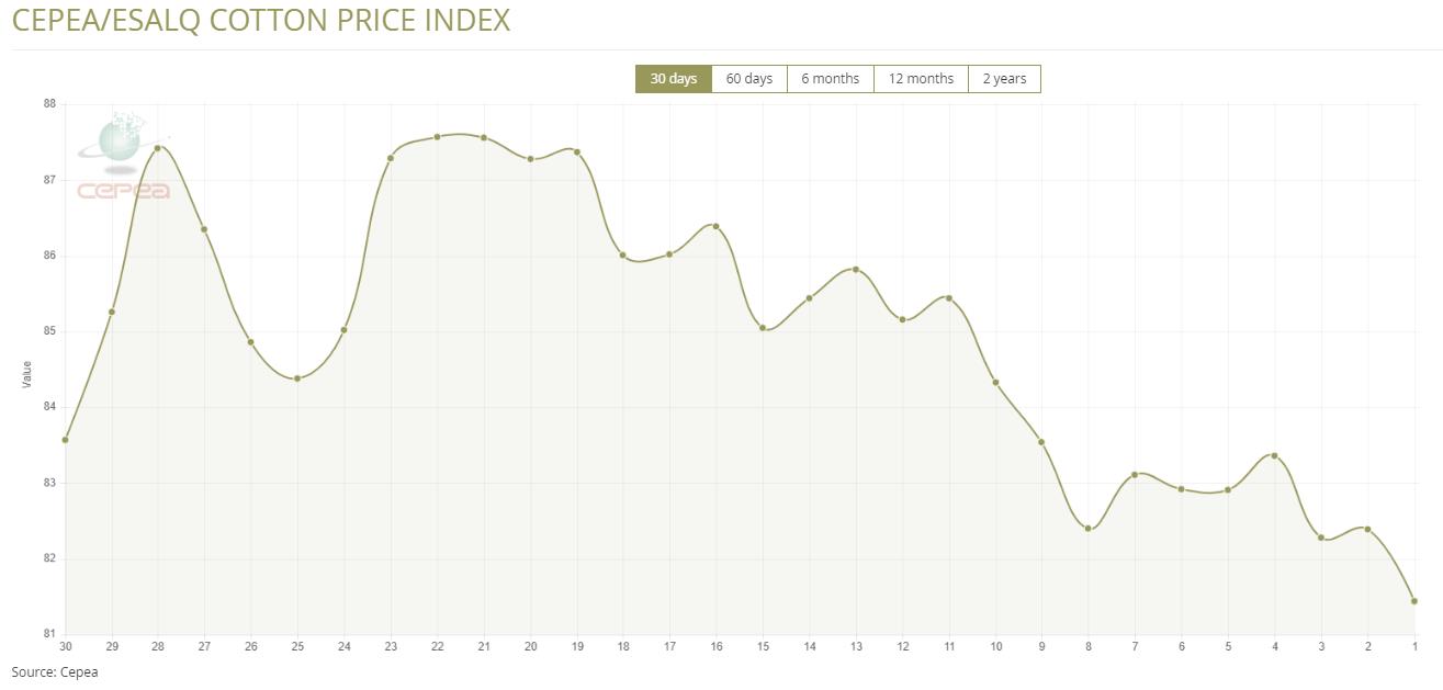 據(jù)外電3月28日消息,3月28日巴西CEPEA/ESALQ棉花價(jià)格指數(shù)報(bào)每磅81.44美分,較前一日下跌1.15%。