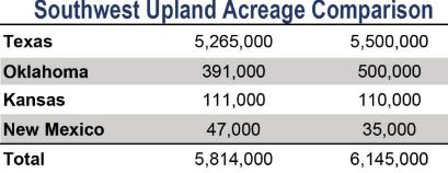 美國農(nóng)業(yè)部(USDA)的種植意向報(bào)告有點(diǎn)令人意外,2024年美國棉花種植面積預(yù)計(jì)為1067萬英畝,其中陸地棉1047萬英畝、皮馬棉20萬英畝。這一數(shù)字高于國家棉花委員會(NCC)2月調(diào)查所預(yù)計(jì)的960萬英畝。新的估計(jì)表明,2024年總種植面積將比2023年增加44.3萬英畝,增幅4.3%。其中德克薩斯州的下降(-0.7%)被阿肯色州、密西西比州、俄克拉荷馬州的增長所補(bǔ)償。