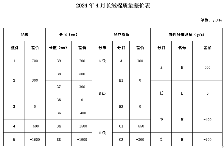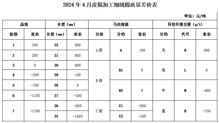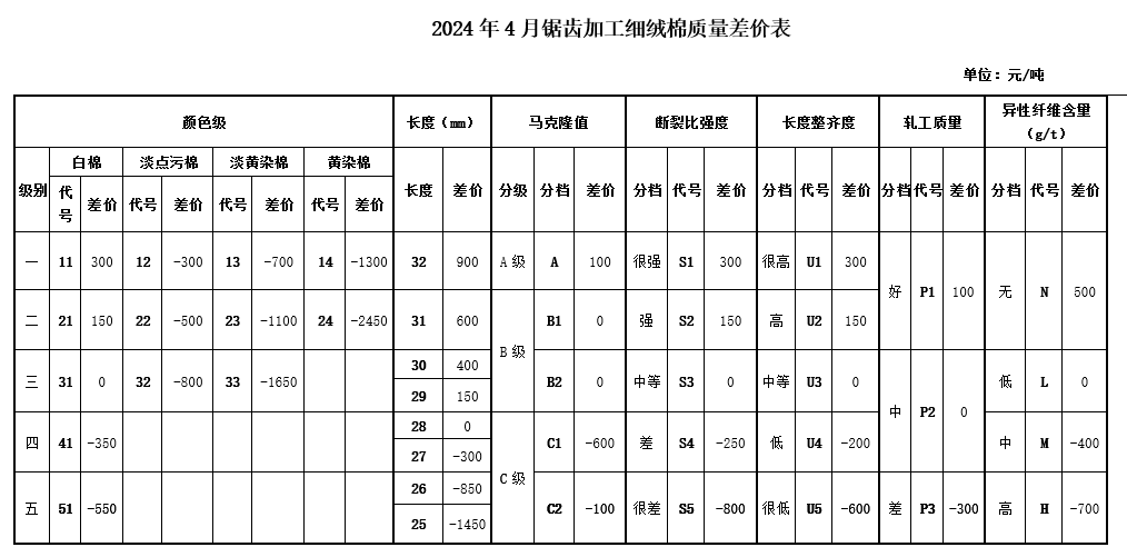 根據(jù)《中國(guó)棉花協(xié)會(huì)國(guó)產(chǎn)棉質(zhì)量差價(jià)表管理辦法》規(guī)定,現(xiàn)正式發(fā)布2024年4月《鋸齒加工細(xì)絨棉質(zhì)量差價(jià)表》、《皮輥加工細(xì)絨棉質(zhì)量差價(jià)表》和《長(zhǎng)絨棉質(zhì)量差價(jià)表》(單位:元/噸)。
