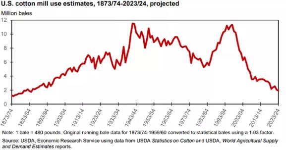 美國農(nóng)業(yè)部下屬農(nóng)業(yè)經(jīng)濟(jì)研究局報(bào)告稱,“在2023/24年度(8月至7月)美國棉紡廠使用量(原棉加工成紡織品的數(shù)量)預(yù)計(jì)為190萬包,創(chuàng)逾一百年來最低水平。前低為1884/85年度,棉花使用量約170萬包?!?/p>