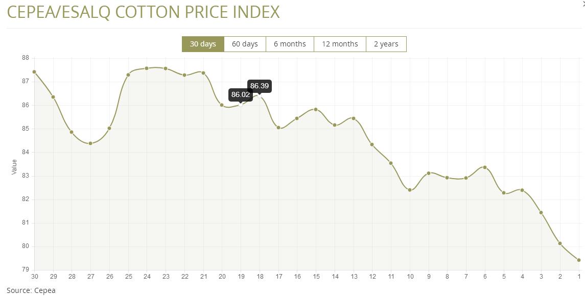 據(jù)外電4月2日消息,4月2日巴西CEPEA/ESALQ棉花價格指數(shù)報每磅79.42美分,較前一日下跌0.89%。