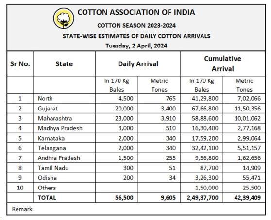 2023/24年度(2023年10月1日至次年9月)迄今,印度棉花到貨量為24937700包或4239409噸。