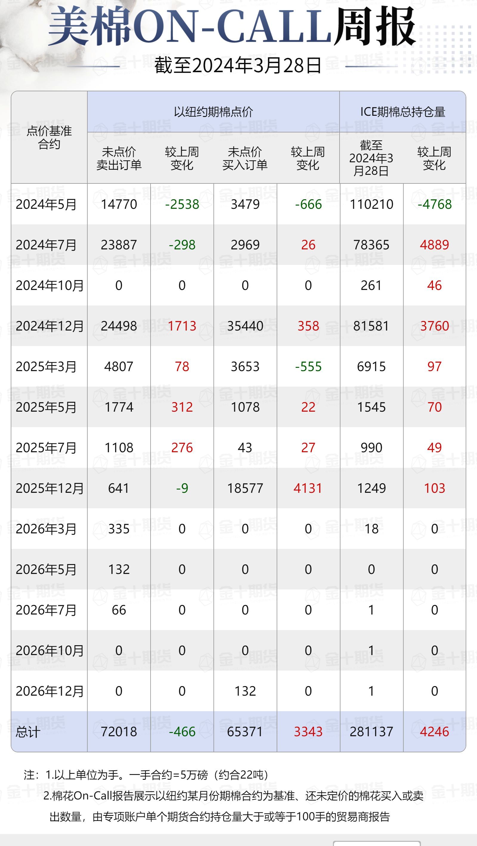 據(jù)美國(guó)商品期貨交易委員會(huì)(CFTC)最新數(shù)據(jù),截至3月28日,①美棉On-Call未點(diǎn)價(jià)賣出訂單72018手,環(huán)比減少466手;未點(diǎn)價(jià)買入訂單65371手,環(huán)比增加3343手;②ICE期棉2405合約上賣方未點(diǎn)價(jià)合約為14770手,較此前一周減少2538手;③ICE期棉2407合約上賣方未點(diǎn)價(jià)合約為23887手,較此前一周減少298手;④ICE棉花期貨盤面2023/24年度(8月至次年7月)的On-Call合約未點(diǎn)價(jià)賣出訂單為38657手,環(huán)比減少2836手。