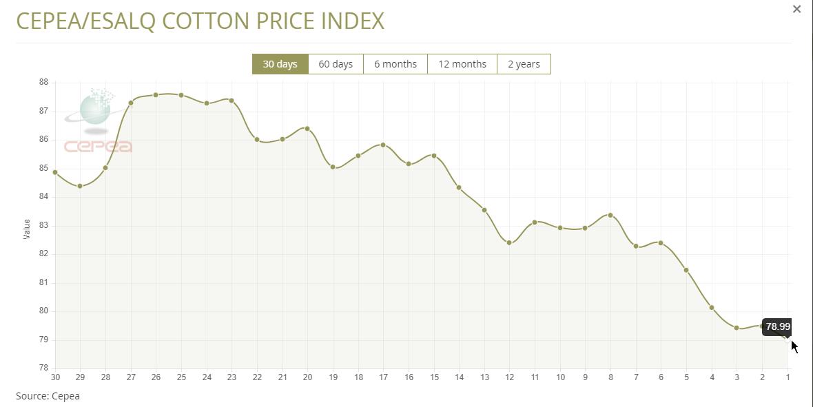 據(jù)外電4月4日消息,4月4日巴西CEPEA/ESALQ棉花價格指數(shù)報每磅78.99美分,較前一日下跌0.62%。
