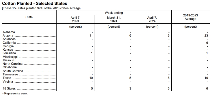 據(jù)美國(guó)農(nóng)業(yè)部網(wǎng)站4月8日消息,美國(guó)農(nóng)業(yè)部(USDA)在每周作物生長(zhǎng)報(bào)告中公布稱,截至2024年4月7日當(dāng)周,美棉種植率為5%,前周為3%,去年同期為5%,五年均值為6%。