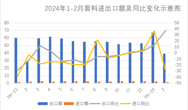 從進(jìn)口看,我國(guó)中間品進(jìn)口大幅增長(zhǎng),1-2月紗線面料進(jìn)口11.7億美元,同比增長(zhǎng)22.5%,主要靠紗線進(jìn)口帶動(dòng)。從具體產(chǎn)品看,紗線進(jìn)口8.2億美元,同比增長(zhǎng)48.3%,面料進(jìn)口3.5億美元,同比下降2%。